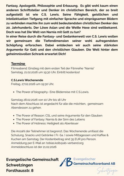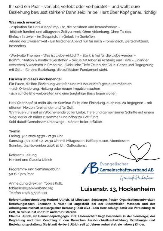 Wenn Sie weitere Informationen möchten oder bei persönlichen Anliegen melden Sie sich bitte bei unseren Pastoren (siehe Rubrik Kontakt).